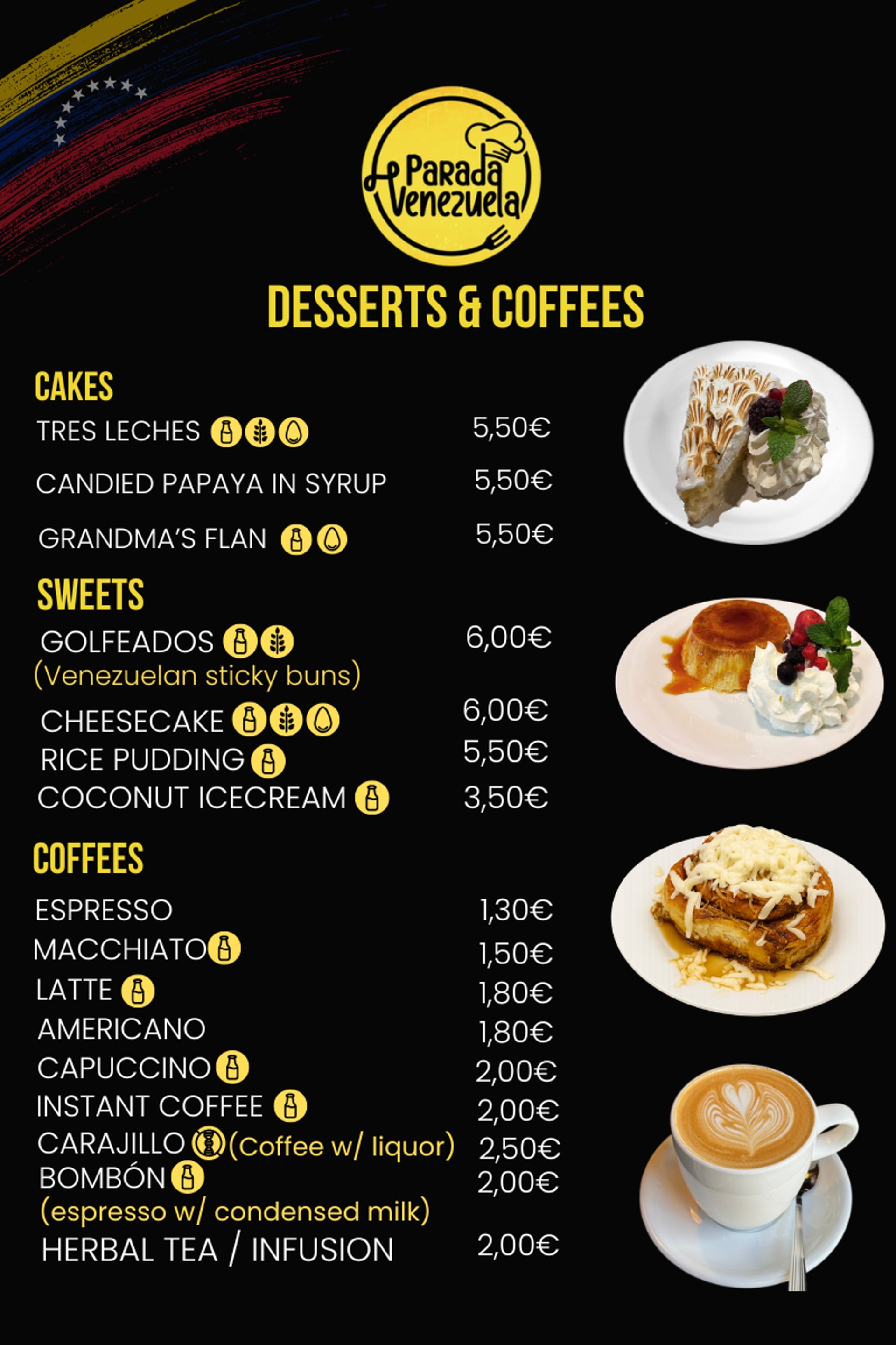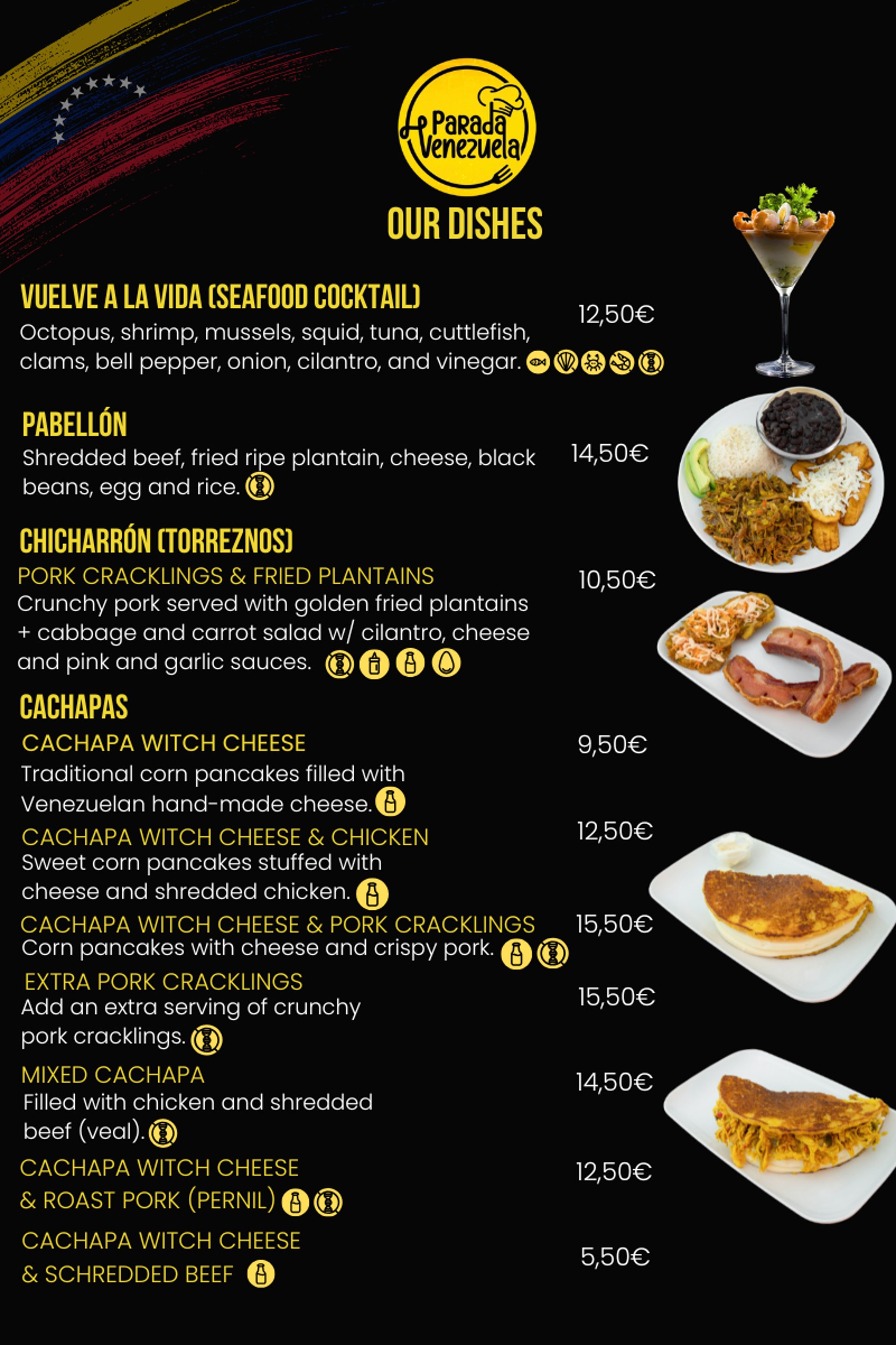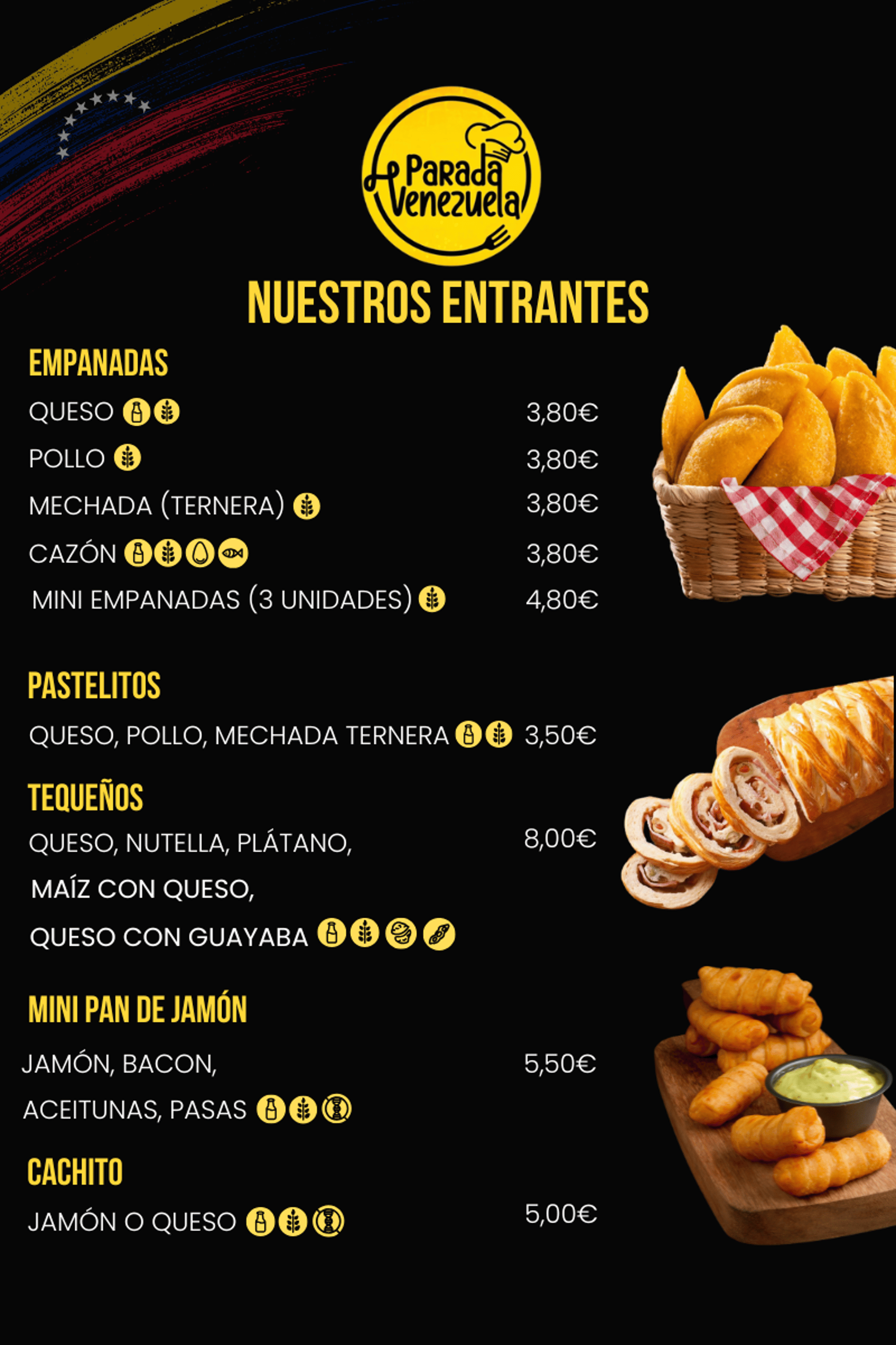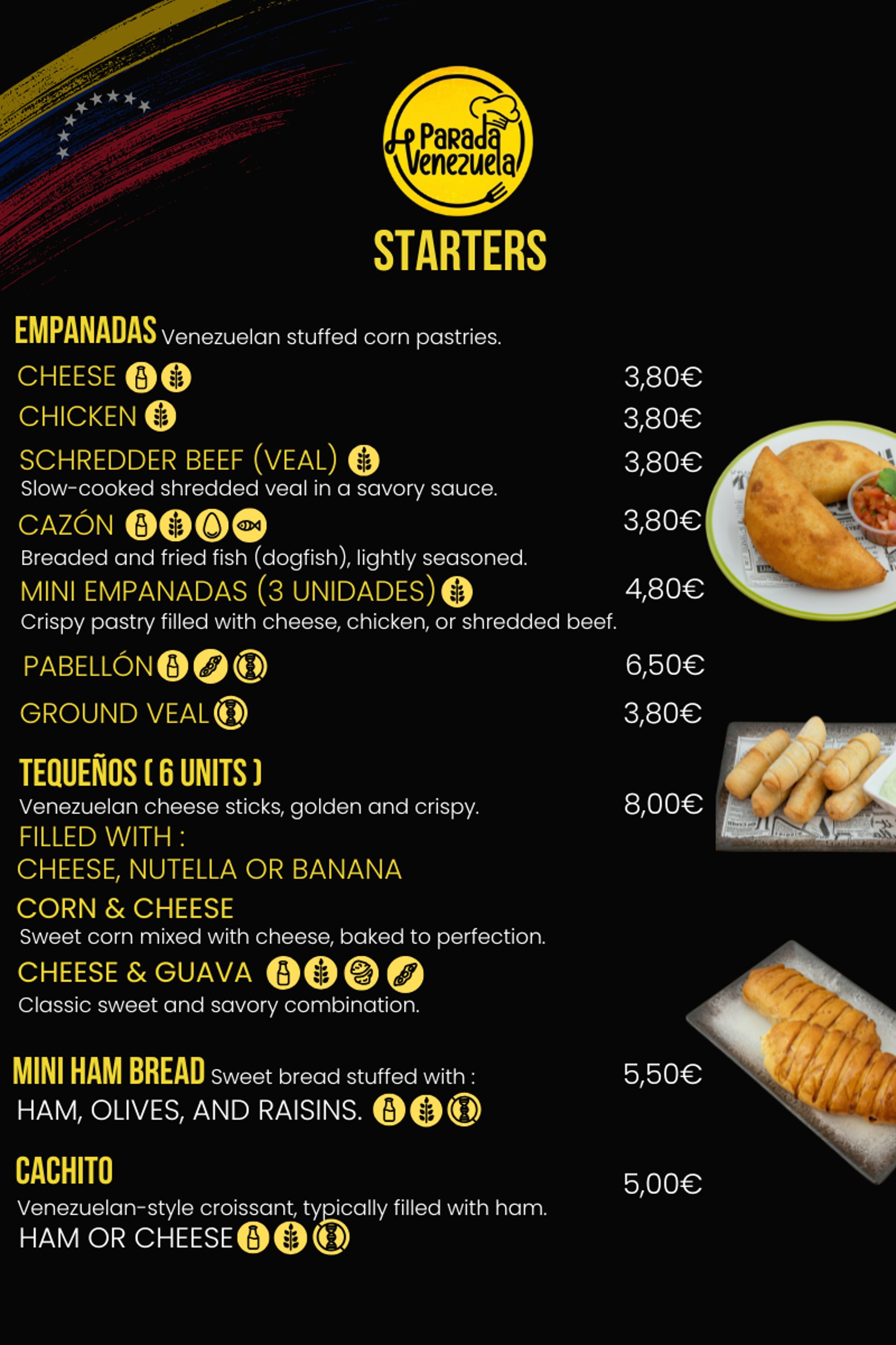 3 Mini Cachapas (with Queso de Mano) Sweet corn pancakes filled with soft Venezuelan cheese.