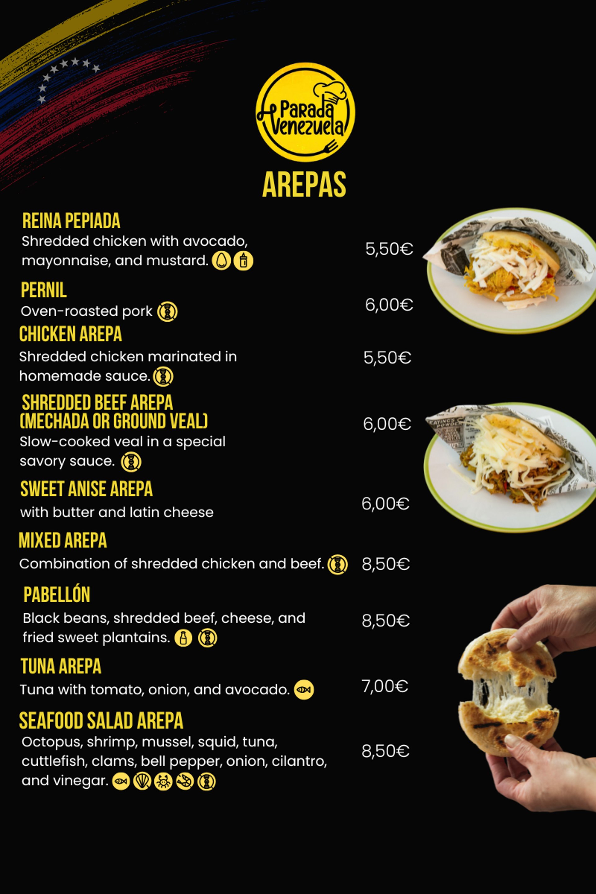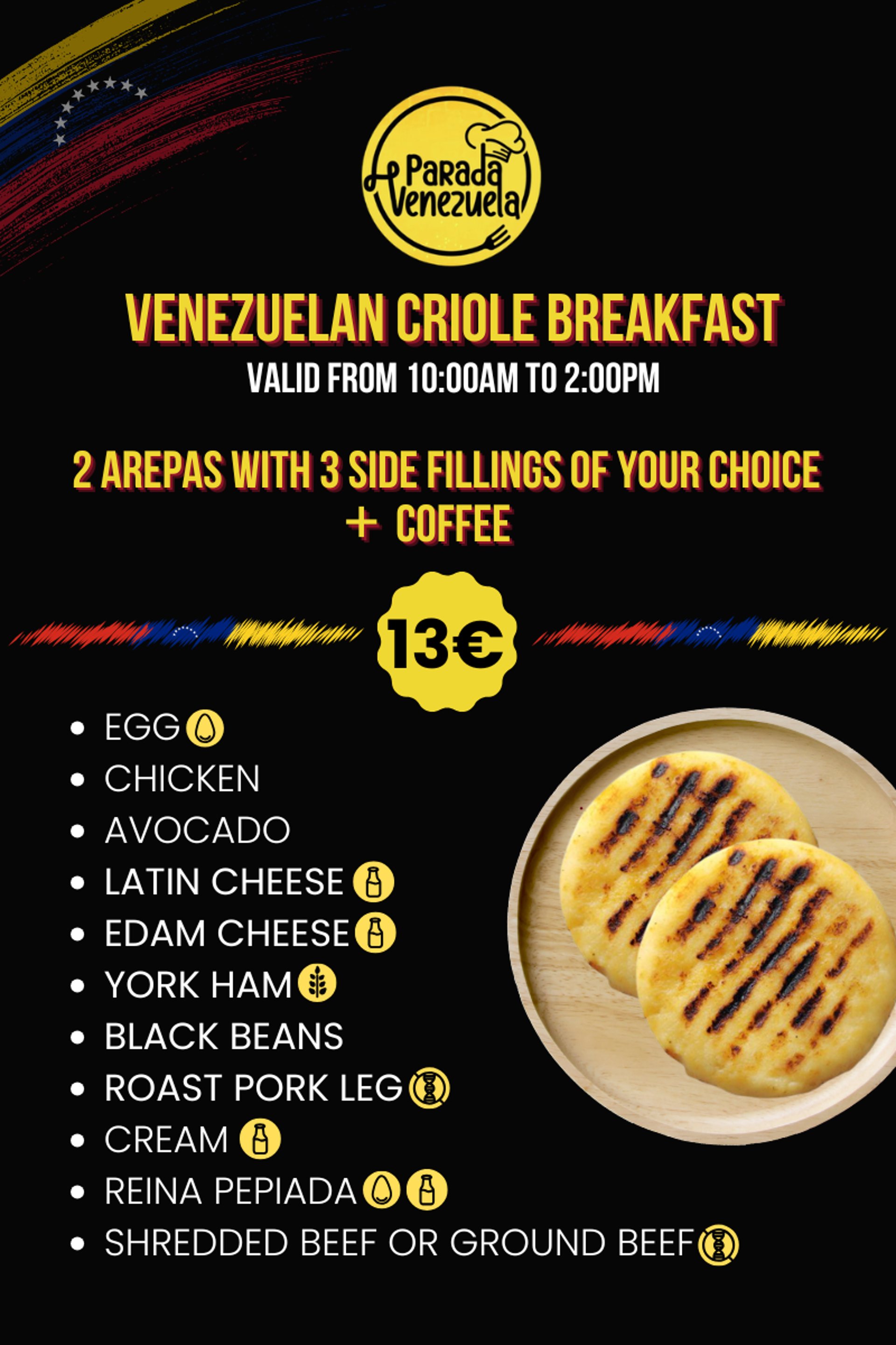 3 Mini Arepas (your choice of filling) Small cornmeal pockets with your preferred filling.